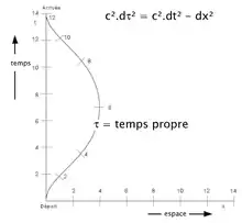 Le temps propre de la trajectoire de la particule est plus court que le temps t mesuré dans le référentiel, contrairement à ce que suggère le dessin.