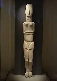 Pour l'âge du Bronze ancien (v. 33/3200-2000 av. J.-C.) la documentation la mieux connue sur les pratiques rituelles est celle des îles des Cyclades, notamment Kavos sur Kéros, où ont été mises au jour de nombreuses figurines et de la vaisselle brisées, apparemment apportées depuis des îles voisines. Les figurines et statues cycladiques de forme humaine pourraient là encore représenter des divinités, mais il n'y a aucun argument décisif en ce sens. Des sites où se déroulent des rituels ont été repérés dans différentes régions[65].