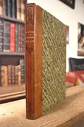 L'art gothique atteint son apogée avec la parution du premier tome des Voyages pittoresques et romantiques dans l'ancienne France en 1820[32], comportant de nombreuses monographies de cathédrales françaises, qui constitue le premier recueil du patrimoine français[32]. Des reliures décorées à la plaque ou aux fleurons inspirés de l'architecture gothique, dites « à la cathédrale » (avec figuration d'ogives, de rosaces, de fenestrages), sont exécutées massivement dans beaucoup d'ateliers[20], dont ceux de Thouvenin, de Simier, puis plus tard d'Antoine Bauzonnet et de son successeur Trautz[33],[34]. Les allures parfois austères des décors aux filets dorés de Bauzonnet, accentuées par les couleurs sombres de ses reliures, ont contrasté avec l'aspect plus riche de celles produites par les autres ateliers[20],[35]. La publication en 1831 de Notre-Dame de Paris apparaît comme le point culminant du goût pour le gothique-romantique[20],[35].