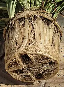 Chlorophytum nécessitant un rempotage car les racines n'ont pas la place de se développer