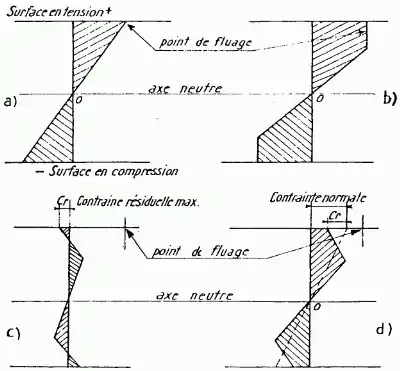 - En (c), la charge a été supprimée. Il subsiste une contrainte résiduelle de compression dans la zone qui était tendue et une contrainte résiduelle de tension dans celle qui était comprimée. Le moment non nul créé par ces contraintes résiduelles « externes » est équilibré par d'autres contraintes « internes » qui apparaissent simultanément.