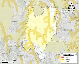 Le retrait-gonflement des sols argileux est susceptible d'engendrer des dommages importants aux bâtiments en cas d’alternance de périodes de sécheresse et de pluie. 30,5 % de la superficie communale est en aléa moyen ou fort (33,6 % au niveau départemental et 48,5 % au niveau national). Sur les 200 bâtiments dénombrés sur la commune en 2019, 74 sont en aléa moyen ou fort, soit 37 %, à comparer aux 25 % au niveau départemental et 54 % au niveau national. Une cartographie de l'exposition du territoire national au retrait gonflement des sols argileux est disponible sur le site du BRGM[16],[Carte 2].