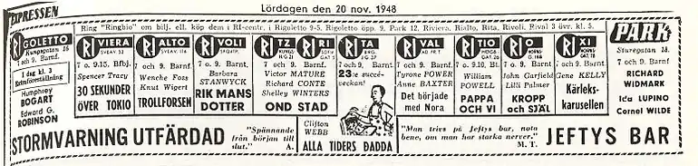 Une publicité pour les salles Ri-Teatrarna parue dans le quotidien suédois Expressen du 20 novembre 1948.