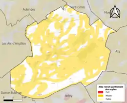 La commune est vulnérable au risque de mouvements de terrains constitué principalement du retrait-gonflement des sols argileux[15]. Cet aléa est susceptible d'engendrer des dommages importants aux bâtiments en cas d’alternance de périodes de sécheresse et de pluie. 70,7 % de la superficie communale est en aléa moyen ou fort (90 % au niveau départemental et 48,5 % au niveau national). Sur les 471 bâtiments dénombrés sur la commune en 2019, 351 sont en aléa moyen ou fort, soit 75 %, à comparer aux 83 % au niveau départemental et 54 % au niveau national. Une cartographie de l'exposition du territoire national au retrait gonflement des sols argileux est disponible sur le site du BRGM[16],[Carte 2].