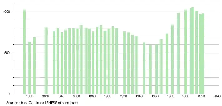L'évolution du nombre d'habitants est connue à travers les recensements de la population effectués dans la commune depuis 1793. Pour les communes de moins de 10 000 habitants, une enquête de recensement portant sur toute la population est réalisée tous les cinq ans, les populations légales des années intermédiaires étant quant à elles estimées par interpolation ou extrapolation[19]. Pour la commune, le premier recensement exhaustif entrant dans le cadre du nouveau dispositif a été réalisé en 2008[20].