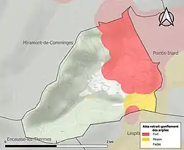 Le retrait-gonflement des sols argileux est susceptible d'engendrer des dommages importants aux bâtiments en cas d’alternance de périodes de sécheresse et de pluie. 37,9 % de la superficie communale est en aléa moyen ou fort (88,8 % au niveau départemental et 48,5 % au niveau national). Sur les 33 bâtiments dénombrés sur la commune en 2019, 33 sont en aléa moyen ou fort, soit 100 %, à comparer aux 98 % au niveau départemental et 54 % au niveau national. Une cartographie de l'exposition du territoire national au retrait gonflement des sols argileux est disponible sur le site du BRGM[26],[Carte 3].