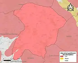 Le retrait-gonflement des sols argileux est susceptible d'engendrer des dommages importants aux bâtiments en cas d’alternance de périodes de sécheresse et de pluie. 99,4 % de la superficie communale est en aléa moyen ou fort (54,2 % au niveau départemental et 48,5 % au niveau national). Sur les 497 bâtiments dénombrés sur la commune en 2019, 492 sont en aléa moyen ou fort, soit 99 %, à comparer aux 57 % au niveau départemental et 54 % au niveau national. Une cartographie de l'exposition du territoire national au retrait gonflement des sols argileux est disponible sur le site du BRGM[13],[Carte 2].