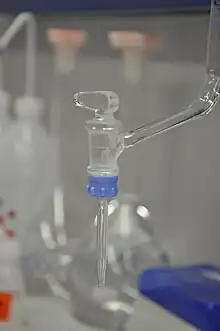 Les robinets d'arrêt font souvent partie de la verrerie de laboratoire, comme les burettes, les ampoules à décanter, les fioles de Schlenk et les colonnes utilisées en chromatographie. Le robinet d'arrêt est un bouchon ou un rotor lisse tamisé avec une poignée, qui s'insère dans un joint femelle correspondant en verre rodé. Le joint femelle fixe est conçu de manière à joindre deux ou plusieurs morceaux de tubes en verre. Le robinet d'arrêt est percé de trous qui permettent de connecter ou de séparer les tubes attachés au joint femelle en tournant partiellement le robinet d'arrêt. La plupart des robinets d'arrêt sont des pièces pleines avec des alésages linéaires, bien que certains soient creux avec des trous simples qui permettent d'aligner les tubes des joints. Le robinet d'arrêt est maintenu avec le joint femelle par un ressort métallique, un dispositif de retenue du bouchon en plastique, un système de rondelles et d'écrous ou, dans certains cas, par le vide. Les bouchons des robinets d'arrêt sont généralement fabriqués en verre rodé ou dans un plastique inerte comme le PTFE. Les robinets d'arrêt en verre rodé sont graissés pour créer un joint étanche et empêcher la fusion du verre. Les robinets en plastique sont tout au plus légèrement huilés.