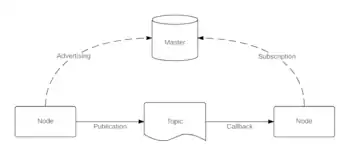 Un node qui publie des données est appelé un publisher et un node qui souscrit à des données est appelé un subscriber. Un node peut être à la fois publisher et subscriber. Les messages envoyés sur les topics sont pour la plupart standardisés ce qui rend le système extrêmement flexible.