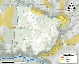 Le retrait-gonflement des sols argileux est susceptible d'engendrer des dommages importants aux bâtiments en cas d’alternance de périodes de sécheresse et de pluie. 6,3 % de la superficie communale est en aléa moyen ou fort (26,8 % au niveau départemental et 48,5 % au niveau national). Sur les 98 bâtiments dénombrés sur la commune en 2019, aucun n'est en aléa moyen ou fort, à comparer aux 36 % au niveau départemental et 54 % au niveau national. Une cartographie de l'exposition du territoire national au retrait gonflement des sols argileux est disponible sur le site du BRGM[16],[Carte 2].