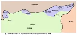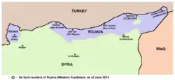 Aujourd'hui[Quand ?], les populations kurdes occupent le long de la frontière turque trois zones étroites séparées, les régions d'Afrine, de Kobané et de Qamichli[7], raison pour laquelle certains auteurs ne parlent pas d’un « Kurdistan syrien » mais plutôt de « régions kurdes de Syrie ».