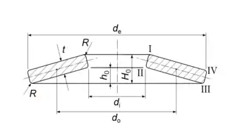 Les principaux paramètres d'une rondelle ressort sont : son diamètre intérieur di, son diamètre extérieur de, son épaisseur t et sa hauteur à vide H0. Dans ces conditions, sa flèche maximale sous charge vaut