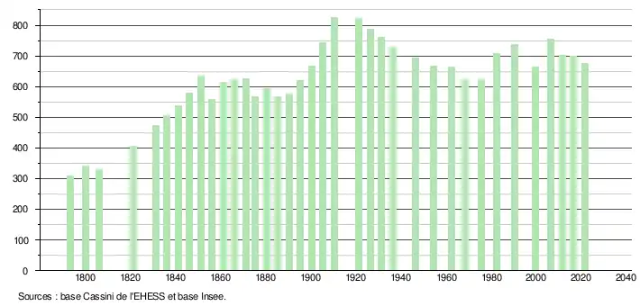 L'évolution du nombre d'habitants est connue à travers les recensements de la population effectués dans la commune depuis 1793. Pour les communes de moins de 10 000 habitants, une enquête de recensement portant sur toute la population est réalisée tous les cinq ans, les populations légales des années intermédiaires étant quant à elles estimées par interpolation ou extrapolation[22]. Pour la commune, le premier recensement exhaustif entrant dans le cadre du nouveau dispositif a été réalisé en 2006[23].