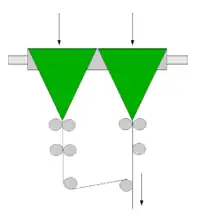 - Les barres de retournement parallèles servent à conduire la moitié de la bande de papier au-dessus ou en dessous de l'autre moitié. La semi-bande déplacée n'est pas retournée, mais transportée parallèlement par rapport au sens de marche initial (le même côté est au-dessus, comme auparavant).