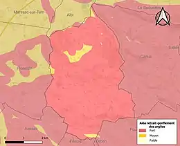 La commune est vulnérable au risque de mouvements de terrains constitué principalement du retrait-gonflement des sols argileux[25]. Cet aléa est susceptible d'engendrer des dommages importants aux bâtiments en cas d’alternance de périodes de sécheresse et de pluie. La totalité de la commune est en aléa moyen ou fort (76,3 % au niveau départemental et 48,5 % au niveau national). Sur les 269 bâtiments dénombrés sur la commune en 2019, 269 sont en aléa moyen ou fort, soit 100 %, à comparer aux 90 % au niveau départemental et 54 % au niveau national. Une cartographie de l'exposition du territoire national au retrait gonflement des sols argileux est disponible sur le site du BRGM[26],[Carte 3].