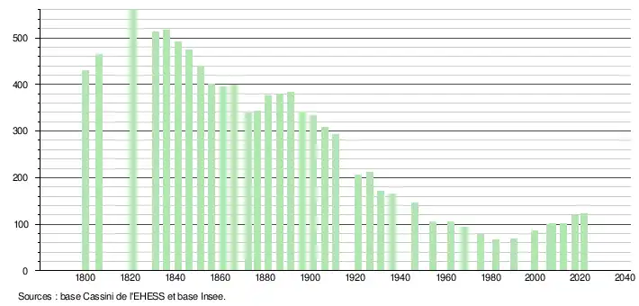 L'évolution du nombre d'habitants est connue à travers les recensements de la population effectués dans la commune depuis 1800. Pour les communes de moins de 10 000 habitants, une enquête de recensement portant sur toute la population est réalisée tous les cinq ans, les populations légales des années intermédiaires étant quant à elles estimées par interpolation ou extrapolation[34]. Pour la commune, le premier recensement exhaustif entrant dans le cadre du nouveau dispositif a été réalisé en 2007[35].