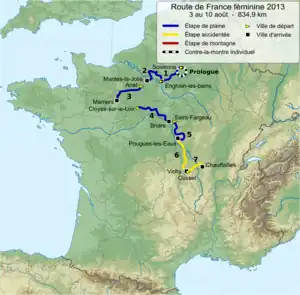 Un an après avoir grimpé la Planche des Belles Filles dans le parcours 2012, un mois après les coureurs du Tour de France, la Route de France féminine revient en 2013, sur un parcours bien plus plat. Comme l'année d'avant, la première étape est réservée au contre-la-montre individuel. Il se déroule sur un tracé de 3,8 km du côté de Soissons dans le département de l'Aisne. Ensuite l'épreuve contourne la capitale parisienne par Mantes-la-Jolie, Mamers et Cloyes-sur-le-Loir, pour finir sa course sur un parcours un peu plus vallonné du côté de Cusset en région auvernoise et de Chauffailles en région bourguignonne.
