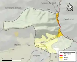 Les mouvements de terrains susceptibles de se produire sur la commune sont soit des chutes de blocs, soit des glissements de terrains, soit des mouvements liés au retrait-gonflement des argiles. Près de 50 % de la superficie du département est concernée par l'aléa retrait-gonflement des argiles, dont la commune de Rouze[41]. L'inventaire national des cavités souterraines permet par ailleurs de localiser celles situées sur la commune[42].
