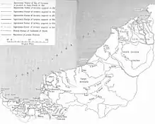 - La 3e division, également la plus grande en termes de superficie, est le fruit des annexions consenties des tribus indigènes sous l'influence du Sarawak en 1861. Elle s'étend du sud de l'embouchure du Rejang jusqu'à l'est de la ville de Bintulu. C'est dans cette division que se situe la ville de Mukah (en), le lieu de l'incident diplomatique entre le Sarawak et le Royaume-Uni quand les troupes de Brooke font face à un bateau à vapeur aux intentions hostiles de la Royal Navy[79],[80].