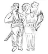 Sur leurs pièces et dans l'art du Gandhara, les Indo-Parthes sont dépeints avec de courtes vestes croisées et de grands pantalons bouffants, costume éventuellement complété par un sur-pantalon[15]. Leurs vestes sont ornées de rangées d'anneaux ou de médailles décoratives. Leur chevelure est généralement touffue et contenue avec un bandeau, une pratique largement adoptée par les Parthes à partir du Ier siècle de notre ère[16]. Des individus en tenue indo-parthe sont parfois présentés dans les scènes de dévotion bouddhistes, sur des éléments architecturaux.