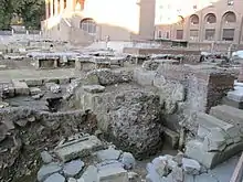 Enfin, la mise en défense de la cité est attribuée à Servius Tullius. Il fait entourer la ville d'une haute levée de terre (agger) renforcée de grosses dalles et précédée d'un fossé. Cette fortification est antérieure à la muraille en gros blocs de tuf volcanique improprement dite mur servien[40].