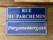 Des plaques de rues bilingues, à la fois en français et en alsacien, sont mises en place par la municipalité à partir de 1995[3]. C'est le cas de la Pergamentergass.