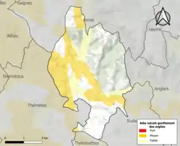 Le retrait-gonflement des sols argileux est susceptible d'engendrer des dommages importants aux bâtiments en cas d’alternance de périodes de sécheresse et de pluie. 31,3 % de la superficie communale est en aléa moyen ou fort (67,7 % au niveau départemental et 48,5 % au niveau national). Sur les 133 bâtiments dénombrés sur la commune en 2019, 35 sont en aléa moyen ou fort, soit 26 %, à comparer aux 72 % au niveau départemental et 54 % au niveau national. Une cartographie de l'exposition du territoire national au retrait gonflement des sols argileux est disponible sur le site du BRGM[24],[Carte 2].