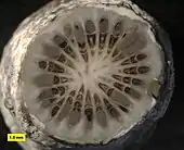 Coupe de Stereolasma rectum, un corail Rugosa du Dévonien moyen, dans le comté d'Erie, État de New-York (USA).