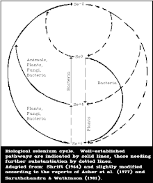 Le sélénium est un oligoélément et un bioélément, mais à très faible dose. Il est toxique (voire très toxique sous certaines formes) à des concentrations à peine plus élevées que celles qui en font un oligoélément indispensable au régime animal. Il n'a pas d'effet majeur sur les maladies, mis à part les graves intoxications aux métaux lourds[6]. Le soufre et le sélénium sont très souvent interchangeables, mais aucunement dans le rôle nutritif sélectif du sélénium. Les territoires du globe terrestre pouvaient être caractérisés par le taux moyen de Se dans le sang humain dans les années 1990, il existait des zones riches et pauvres selon ce critère, le Venezuela figurant en tête avec 0,8 µg/L et l'Égypte en queue de peloton avec 0,07 µg/L[citation nécessaire].
