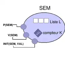 Pmet en attente le processus courant jusqu'à ce qu'une ressource soit disponible, ressource qui sera immédiatement allouée au processus courant. Vest l'opération inverse; elle rend simplement une ressource disponible à nouveau après que le processus a terminé de l'utiliser.Initest seulement utilisé pour initialiser le sémaphore. Cette opération ne doit être utilisée qu'une seule et unique fois.