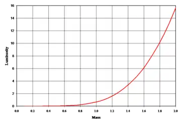 - les étoiles de la séquence principale, dont la masse est entre 0,1 et 50 M☉[50], suivent une loi empirique de corrélation où la luminosité est proportionnelle à une puissance de la masse[51] : .