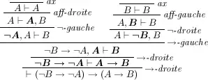 Une démonstration de LK est un arbre de séquents construit au moyen des règles ci-dessus de façon que chaque séquent soit conclusion d'exactement une règle ; la démonstration est terminée si l'on arrive à ce que toutes les feuilles de l'arbre soient des règles axiome. Le séquent racine de l'arbre est la conclusion de la démonstration. Voici un exemple de démonstration du principe de contraposition de l'implication ; pour simplifier on a omis les utilisations de règles d'échange et représenté en gras les (occurrences de) formules dans les séquents prémisses sur lesquelles porte chaque règle :