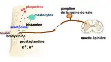 L'inflammation consécutive à une lésion tissulaire libère un grand nombre de médiateurs qui vont activer les terminaisons des fibres afférentes primaires (FAP) de type C et Aδ (dont les corps cellulaires sont situés dans les ganglions des racines dorsales) chargés de transmettre l'information nociceptive au cerveau par la voie spinothalamique. Les terminaisons de ces FAP nociceptives comportent une large panoplie de récepteurs et canaux[28]. Les fibres C déchargent lorsque de la sérotonine se lie aux récepteurs ionotropes 5-HT3 qu'elles expriment. Ces terminaisons comportent aussi des récepteurs couplés à une protéine G, comme les récepteurs sérotoninergiques 5-HT2A et aussi à un moindre degré 5-HT1A, et des récepteurs aux autres molécules algogènes comme la bradykinine, de l'histamine, etc.