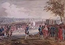 Il y avait une telle cohue de curieux accourus de Paris que les régiments manœuvraient presque au milieu de la foule et que les camelots, bouquetières, vendeurs d'oublys et de plaisir-mesdames se sauvaient devant les premiers rangs pour se réfugier à l'abri des carrosses.