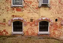 Lors de la construction, l'entrée principale se faisait par un arc central en plein cintre sur le devant, qui était surmonté d'un fronton entouré de pilastres doriques. Une fenêtre en plein cintre et un linteau flanquaient de chaque côté l'entrée principale, tandis qu'un pilastre était situé à chaque coin[35]. En 1873, un observateur a déclaré que la chapelle était un « bâtiment en brique simple mais beau, sans coupole ni beffroi »[37]. Les murs sont repeints cette année-là, avec des éléments décoratifs ressemblant à des panneaux et des pilastres. Le beffroi et les vitraux datent de 1883. La chapelle a été déplacée à 200 pieds ( Unité « » inconnue du modèle {{Conversion}}.) de son emplacement précédent en 1893[35]. Veteran's Memorial Hall a été endommagé en 2014[38] et le bâtiment est fermé au public depuis 2018[29].