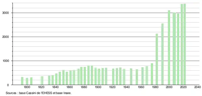 L'évolution du nombre d'habitants est connue à travers les recensements de la population effectués dans la commune depuis 1793. Pour les communes de moins de 10 000 habitants, une enquête de recensement portant sur toute la population est réalisée tous les cinq ans, les populations légales des années intermédiaires étant quant à elles estimées par interpolation ou extrapolation[26]. Pour la commune, le premier recensement exhaustif entrant dans le cadre du nouveau dispositif a été réalisé en 2007[27].