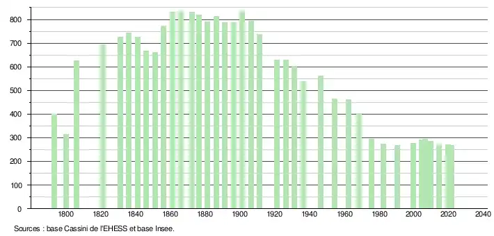 L'évolution du nombre d'habitants est connue à travers les recensements de la population effectués dans la commune depuis 1793. Pour les communes de moins de 10 000 habitants, une enquête de recensement portant sur toute la population est réalisée tous les cinq ans, les populations légales des années intermédiaires étant quant à elles estimées par interpolation ou extrapolation[20]. Pour la commune, le premier recensement exhaustif entrant dans le cadre du nouveau dispositif a été réalisé en 2004[21].