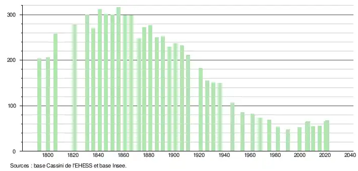 L'évolution du nombre d'habitants est connue à travers les recensements de la population effectués dans la commune depuis 1793. Pour les communes de moins de 10 000 habitants, une enquête de recensement portant sur toute la population est réalisée tous les cinq ans, les populations légales des années intermédiaires étant quant à elles estimées par interpolation ou extrapolation[25]. Pour la commune, le premier recensement exhaustif entrant dans le cadre du nouveau dispositif a été réalisé en 2005[26].