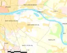 La commune de Saint-Denis-en-Val se trouve dans le quadrant sud-ouest du département du Loiret, dans la région agricole du Val de Loire[3] et l'aire urbaine d'Orléans[4]. À vol d'oiseau, elle se situe à 4,7 km d'Orléans[5], préfecture du département, et à 2,3 km de Saint-Jean-le-Blanc, ancien chef-lieu du canton dont dépendait la commune avant mars 2015. La commune fait partie du bassin de vie d'Orléans[4].