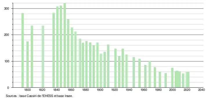 L'évolution du nombre d'habitants est connue à travers les recensements de la population effectués dans la commune depuis 1793. Pour les communes de moins de 10 000 habitants, une enquête de recensement portant sur toute la population est réalisée tous les cinq ans, les populations légales des années intermédiaires étant quant à elles estimées par interpolation ou extrapolation[22]. Pour la commune, le premier recensement exhaustif entrant dans le cadre du nouveau dispositif a été réalisé en 2004[23].