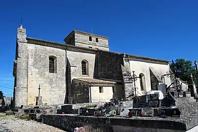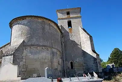 - L’abside : Un pan droit, au nord est, une corniche à mi-hauteur, avec des modillons variés, un contrefort plat à l’angle du clocher, une baie romane à cintre monolithe. Un contrefort plat, et un pan courbe de l’abside toujours sous la corniche. Un énorme contrefort à talus désaxé vers le sud, rejoint par le mur de la sacristie.