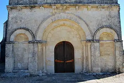 - La façade est sculptée de trois arcades en plein cintre. Le portail situé dans l’arcade centrale est orné de deux voussures, la supérieurs étant ornée. Ces voussures retombent de chaque côté sur deux colonnes aux chapiteaux nus, dont les pierres d’appui continuent en bandeau dans les voussures latérales. Au-dessus de l’arcature, une corniche à modillons variés, un pan de mur en rectangle long, la base du pignon triangulaire à trois côtés ornés.