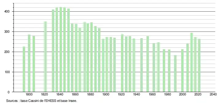 L'évolution du nombre d'habitants est connue à travers les recensements de la population effectués dans la commune depuis 1793. Pour les communes de moins de 10 000 habitants, une enquête de recensement portant sur toute la population est réalisée tous les cinq ans, les populations légales des années intermédiaires étant quant à elles estimées par interpolation ou extrapolation[35]. Pour la commune, le premier recensement exhaustif entrant dans le cadre du nouveau dispositif a été réalisé en 2006[36].