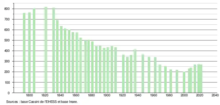 L'évolution du nombre d'habitants est connue à travers les recensements de la population effectués dans la commune depuis 1793. Pour les communes de moins de 10 000 habitants, une enquête de recensement portant sur toute la population est réalisée tous les cinq ans, les populations légales des années intermédiaires étant quant à elles estimées par interpolation ou extrapolation[17]. Pour la commune, le premier recensement exhaustif entrant dans le cadre du nouveau dispositif a été réalisé en 2008[18].