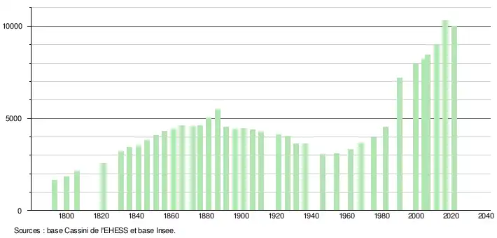 - Par convention dans Wikipédia, le principe a été retenu de n’afficher dans le tableau des recensements et le graphique, pour les populations légales postérieures à 1999, que les populations correspondant à une enquête exhaustive de recensement pour les communes de moins de 10 000 habitants, et que les populations des années 2006, 2011, 2016, etc. pour les communes de plus de 10 000 habitants, ainsi que la dernière population légale publiée par l’Insee pour l'ensemble des communes.