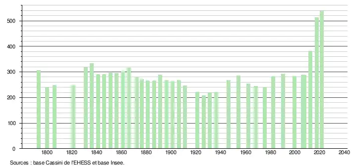L'évolution du nombre d'habitants est connue à travers les recensements de la population effectués dans la commune depuis 1793. Pour les communes de moins de 10 000 habitants, une enquête de recensement portant sur toute la population est réalisée tous les cinq ans, les populations légales des années intermédiaires étant quant à elles estimées par interpolation ou extrapolation[28]. Pour la commune, le premier recensement exhaustif entrant dans le cadre du nouveau dispositif a été réalisé en 2007[29].