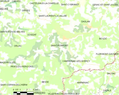 Saint-Pompon est limitrophe de cinq autres communes. Au sud-est, son territoire est distant d'environ 350 mètres de celui de Marminiac (dans le Lot) et au sud-ouest de 380 mètres de celui de Prats-du-Périgord.