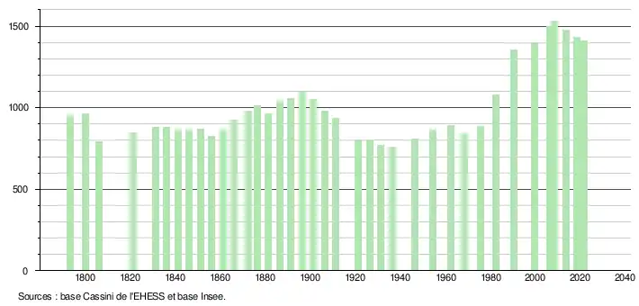 L'évolution du nombre d'habitants est connue à travers les recensements de la population effectués dans la commune depuis 1793. Pour les communes de moins de 10 000 habitants, une enquête de recensement portant sur toute la population est réalisée tous les cinq ans, les populations légales des années intermédiaires étant quant à elles estimées par interpolation ou extrapolation[16]. Pour la commune, le premier recensement exhaustif entrant dans le cadre du nouveau dispositif a été réalisé en 2008[17].