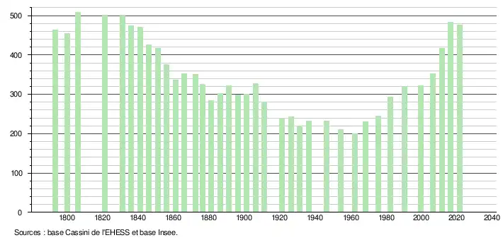 L'évolution du nombre d'habitants est connue à travers les recensements de la population effectués dans la commune depuis 1793. Pour les communes de moins de 10 000 habitants, une enquête de recensement portant sur toute la population est réalisée tous les cinq ans, les populations légales des années intermédiaires étant quant à elles estimées par interpolation ou extrapolation[22]. Pour la commune, le premier recensement exhaustif entrant dans le cadre du nouveau dispositif a été réalisé en 2006[23].