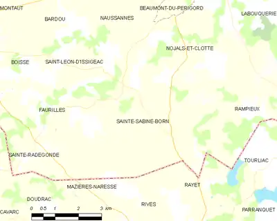 En 2015, année précédant la création de la commune nouvelle de Beaumontois en Périgord, Sainte-Sabine-Born était limitrophe de neuf autres communes, dont trois dans le département de Lot-et-Garonne. Au sud, la commune de Rives était limitrophe par un quadripoint.